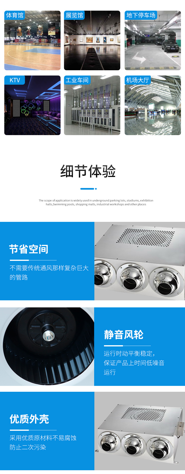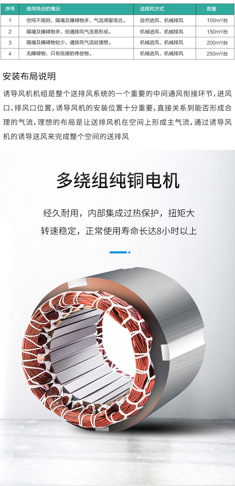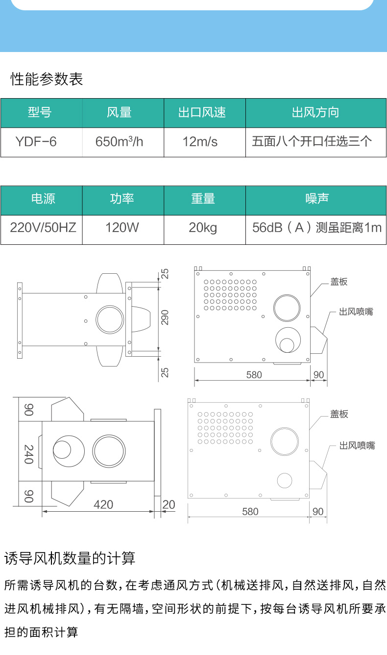 YDF型誘導風機主要用于無風管條件下,將多臺誘導風機按一定距離和方向依次排列,以少量高速噴流氣體帶動誘導周圍靜止的空氣,達到高效經濟的通風換氣效果。也可單獨布置在通風死角區,通過誘導風機高速噴流達到稀釋廢氣作用。